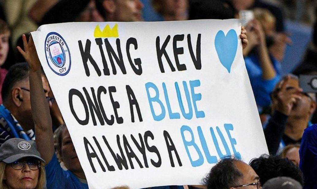 双方球员进场,德布劳内受到了曼城球迷疯狂的欢迎。看台上,球迷展示了他们精心准备的巨大tifo,上面写着“king kev(国王凯文)”、“一日为蓝,终生为蓝”。德布劳内看到后有些激动。